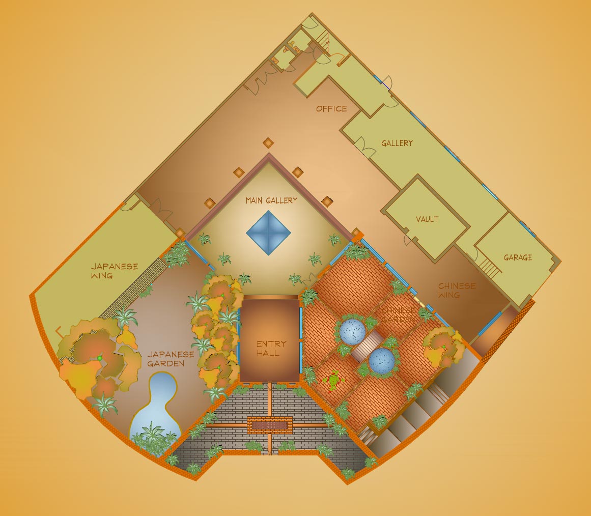 building on the National Historic Register. The lower floor is segregated into ethnic art sections each side with a formal garden, the upstairs housing a studio apartment and a full